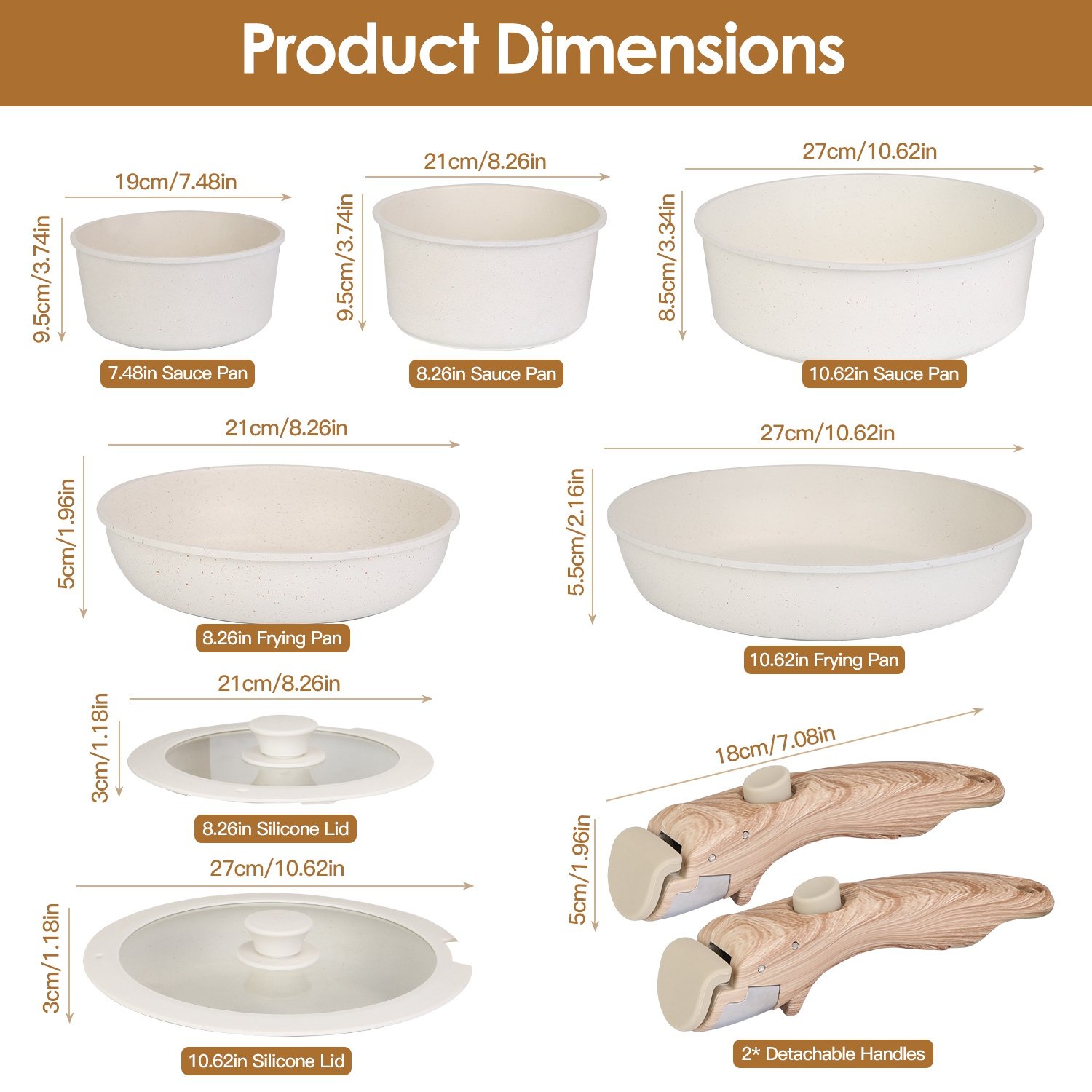 • 9Pcs Complete Cookware Set: Comes with 7.48in/8.26in/10.62in sauce pan, 8.26in/10.62in frying pan, 2* removable handles and 2* matched lids. You can get all kitchen cooking essentials in one package, which easily satisfy various daily cooking demands for you and your whole family.