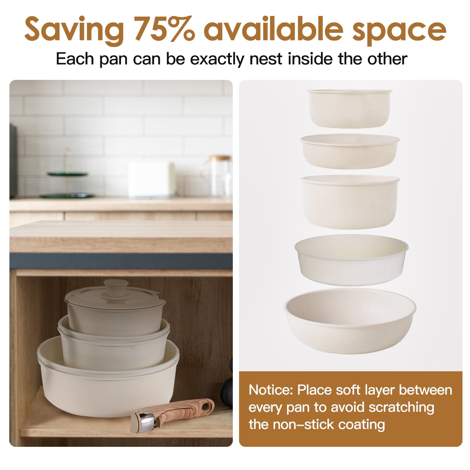 • Non-Stick Granite Coating: Advanced granite coating technology is free of toxic chemicals and effectively prevents food from sticking. Due to its excellent non-stick performance, you can use less oil to make much healthier food in your daily life. Moreover, each pan can be exactly nest inside the other, saving available space when storage. Just pay attention to place soft layer between every pan to avoid scratching the non-stick coating.
