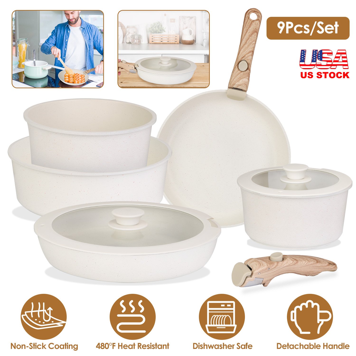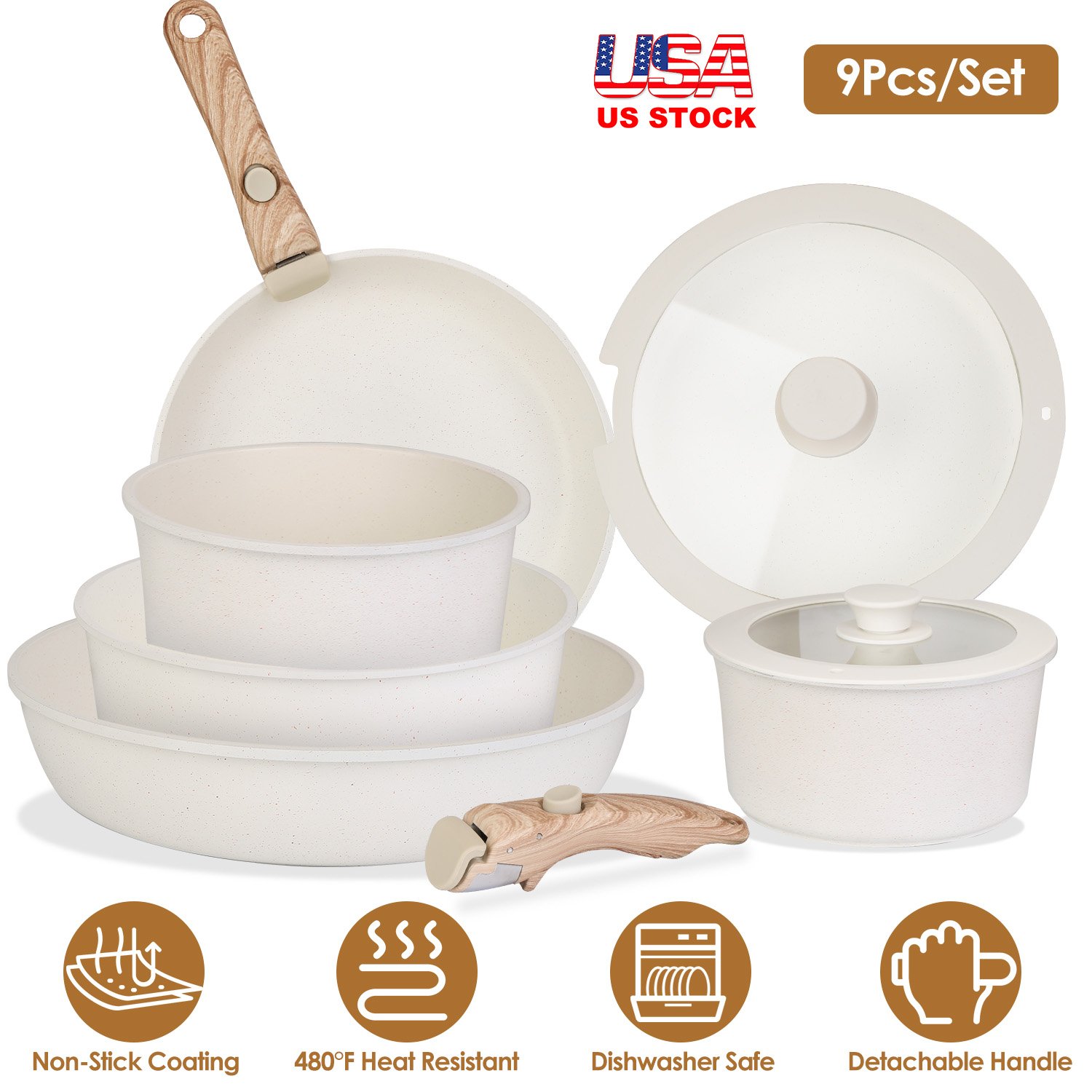 9Pcs Nonstick Cookware Set With Detachable Handles & Tempered Glass Lids