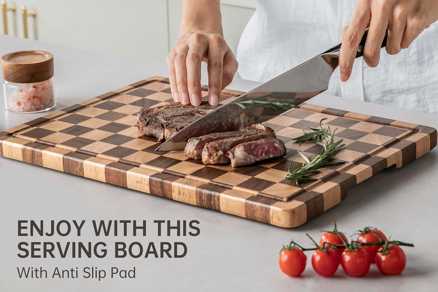 2.MEET ALL YOUR CUTTING NEEDS- This large, smooth acacia wood chopping board features juice grooves on the front to seamlessly catch liquids while chopping and dicing anything. Built-in grooved handles on the sides make it easy to carry ingredients around the kitchen or from the kitchen to the table. Plus, we throw in 4 rubber non-slip pads to keep the board more stable on your marble countertop.