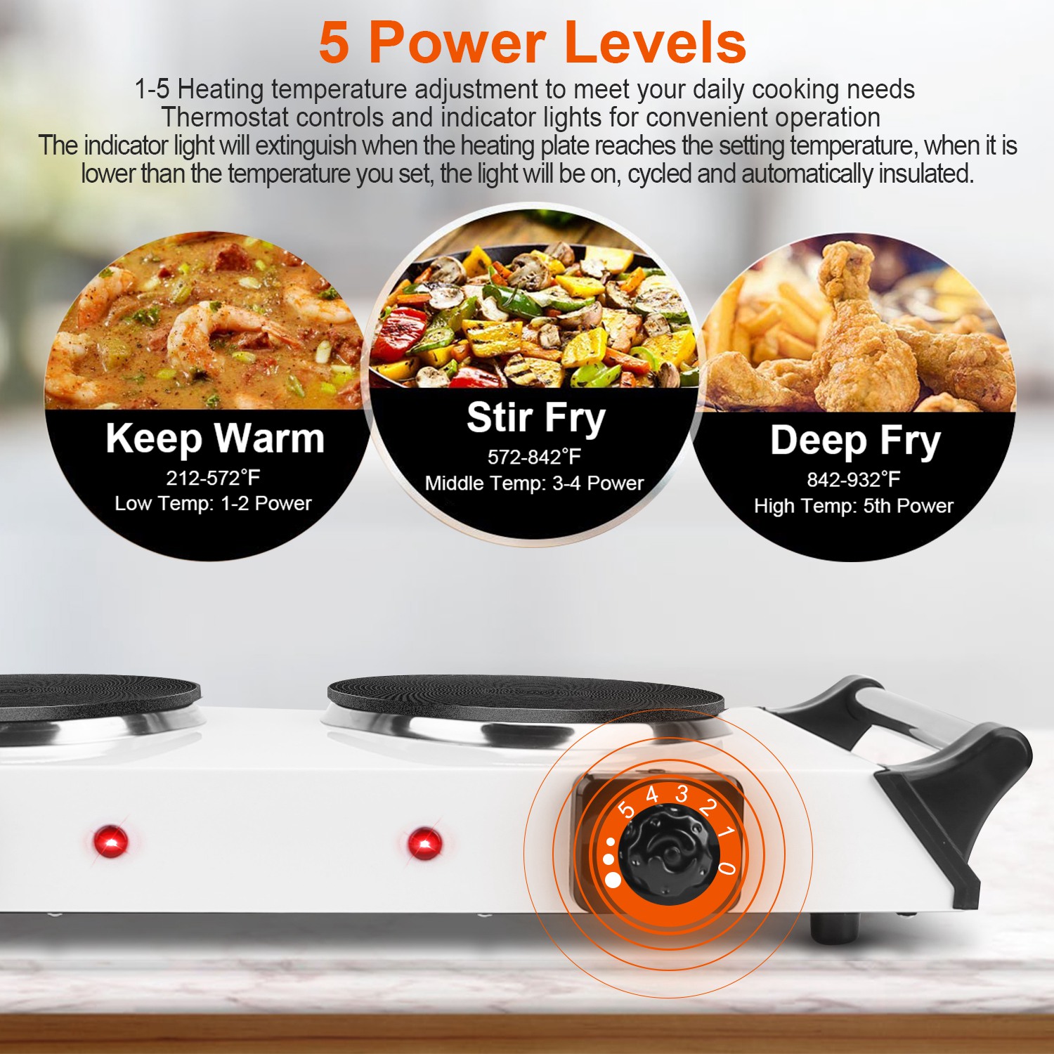 2000W Electric Coil Heating Dual Burner Hot Plate with 5 Temperature Adjustments & Portable Handles, Compact